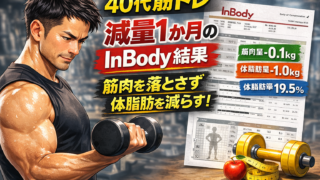40代から筋トレを始めた筆者が、増量期から減量期へ切り替えて1か月後のInBody測定結果を公開。筋肉量をほぼ維持したまま体脂肪率20%を切れた理由や、食事管理・トレーニング内容、下半身の筋肉量が減った原因について実体験をもとに解説します。