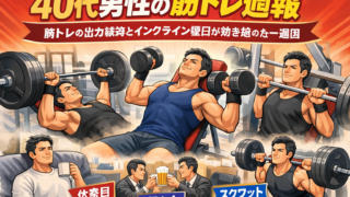 40代男性の筋トレ週報。胸トレでのベンチプレス出力維持、インクラインダンベルプレス導入による刺激の変化、懸垂フォーム改善の効果、休養と飲み会との付き合い方まで、初心者〜中級者に役立つリアルな一週間を詳しく解説。
