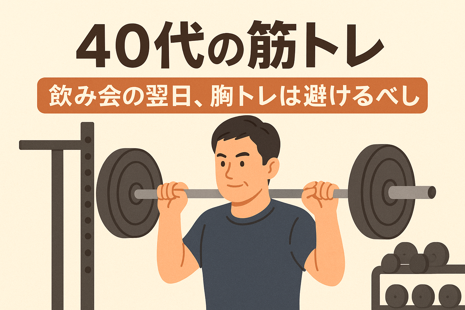 SEO的には「40代 筋トレ」「飲み会 筋トレ」「回復 休養」「胸トレ 中二日」といったキーワードを意識しつつ、リアルな実体験ベースでお伝えします。