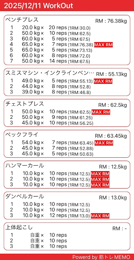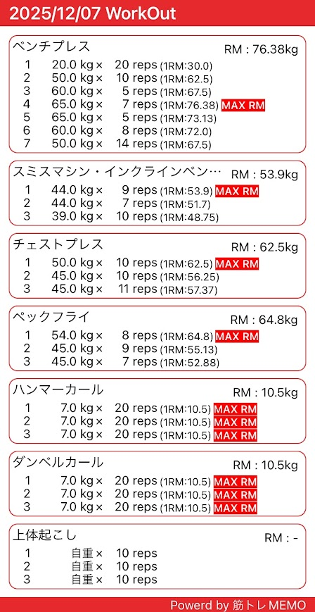日曜日|胸メイン+腕少々(出力回復&記録更新)