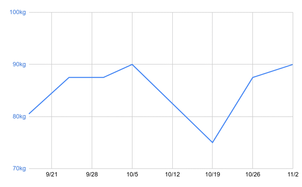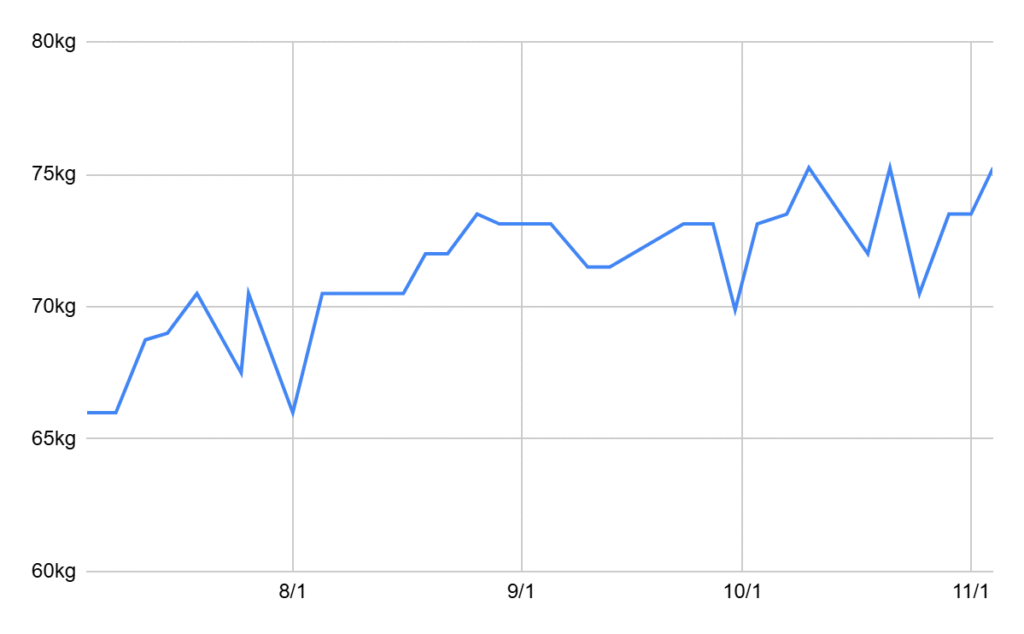 最初はフォーム重視で軽い重量から始めたものの、徐々に「もっと重く!」と挑戦心が芽生え、フリーウェイトで100kgを目指すようになりました。こちらも以下のグラフで推移をご覧ください。まだ、スクワットを始めてから1.5か月ほどですが、これから徐々にあげていければと思います。