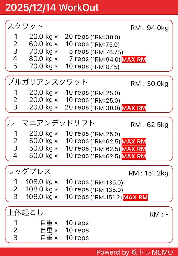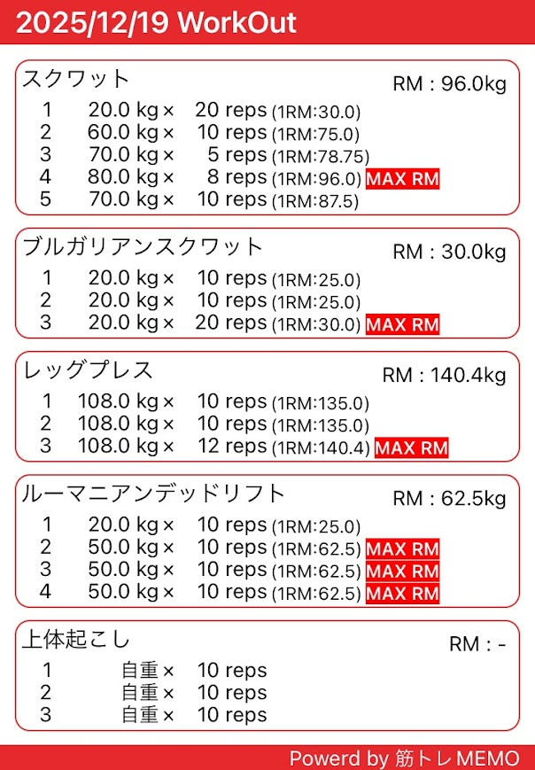 スクワットは80kg×7repを達成し、RM換算ではわずかですが自己記録更新となりました。